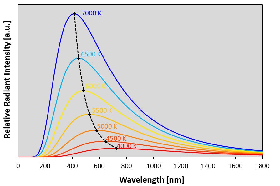 Using Planck’s Law, it is possible to predict the emission spectrum of a black body as a function of temperature. Figure 1 below shows the emission spectra for black body sources at various temperatures between 4000 K and 7000 K.