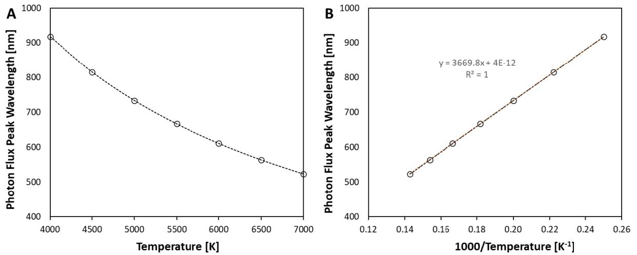 The peak photon flux wavelength for these spectra as a function of temperature (and inverse temperature) is shown below in Figure 4. As expected, the relationship between peak photon flux wavelength and inverse temperature is linear.