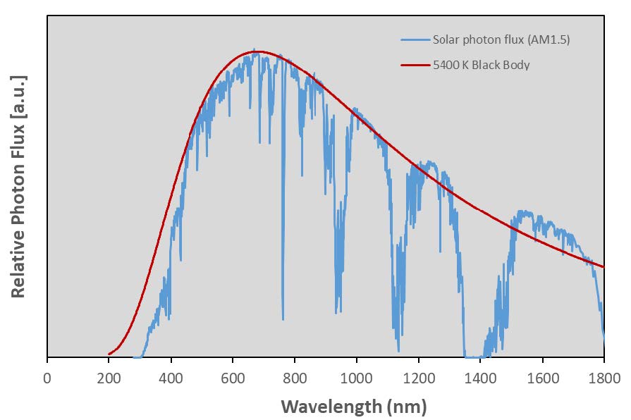 This difference is due to the nature of the solar spectrum which is not smooth and includes absorption and emission lines from elements in the solar chromosphere and atmospheric absorption. A comparison of the photon flux spectrum for a 5400 K black body and AM1.5 is shown below in Figure 5.