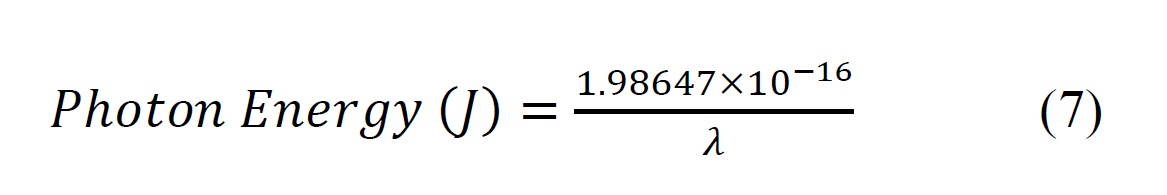The spectral power distribution of an arbitrary black body light source can be calculated using Eq. 4 above. The resulting spectral power distribution can be converted to a spectral photon flux distribution by dividing the radiance at each wavelength by the photon energy for that wavelength. The energy of a photon is given as: